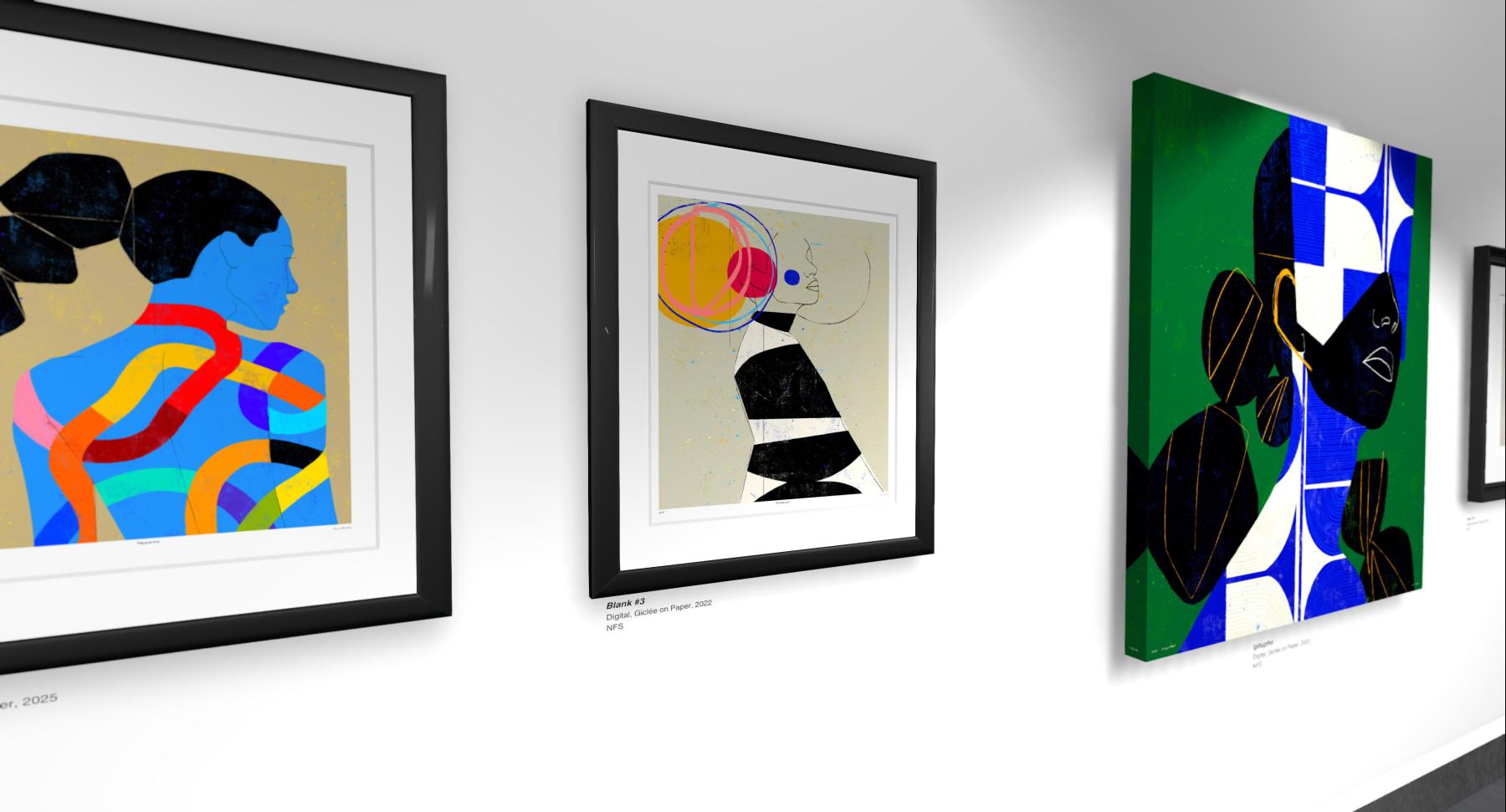 In mixed media, drawing, sculpture, linocut, acrylic, or oil on canvas/ wood, his characters encompass different ethnicities, with empowerment and gestural power. The highlighted line of the designs incorporates a simple color palette with great contrasts.